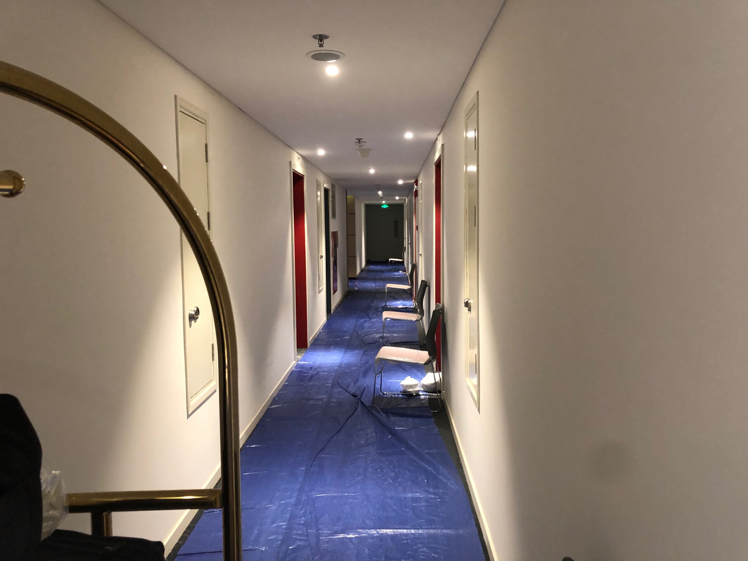 部屋に入るまで防護服です。チェックインを済ませ、鍵とサンドイッチを受け取り、荷物はカートを借りて自分で運びます。廊下等もすべてシートで防護されています。これで長かった1日目がやっと終了です。