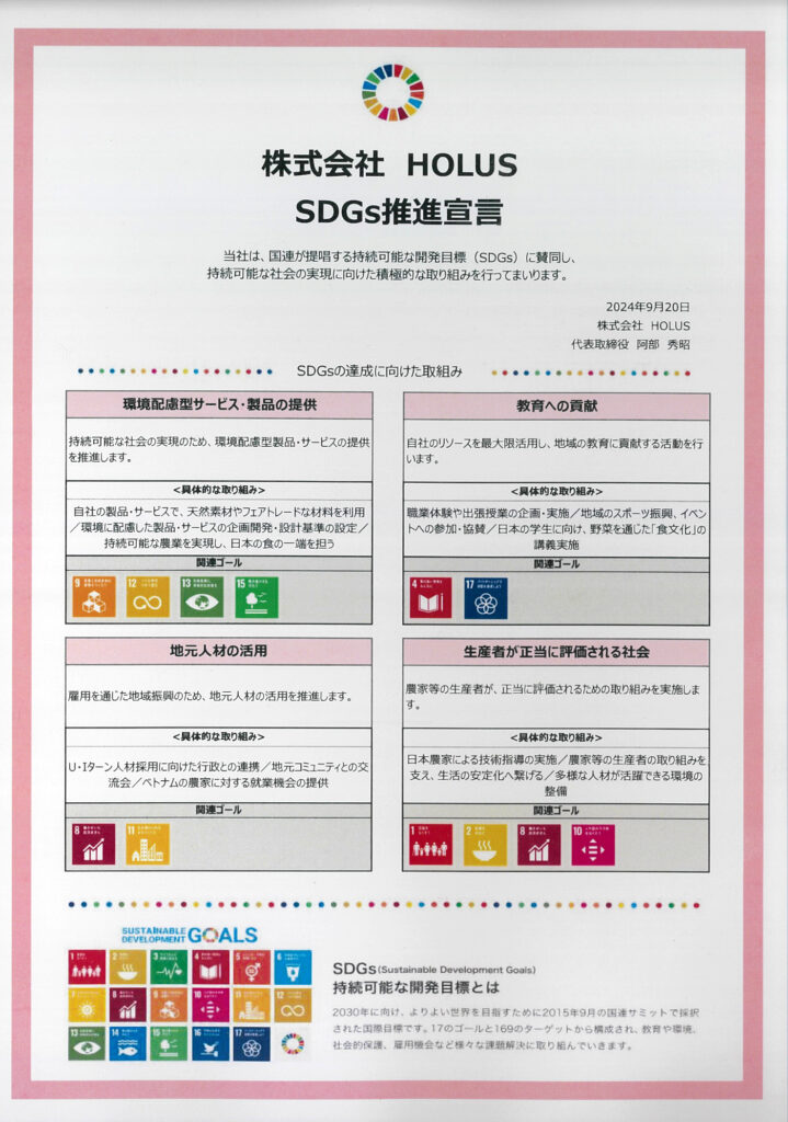 創業以来、生産者が正当に評価される社会を目指して、持続可能な農業や食の在り方を推進してきた株式会社HOLUSではこの度、東日本銀行様のご助力により「SDGs推進宣言書」を策定いたしました。